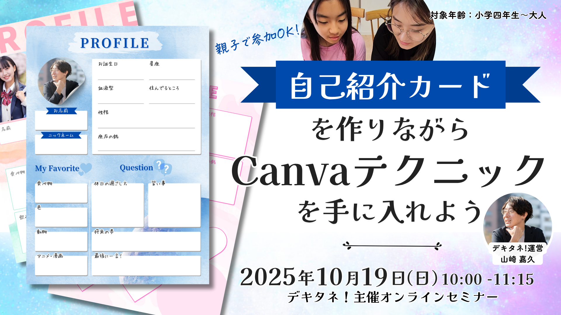 そんな声にお応えして、デキタネ!では、自己紹介カード作成を通じてCanvaテクニックを、プロの講師がたっぷりレクチャーします。